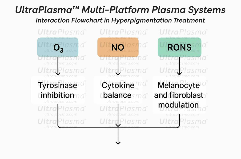 Hyperpigmentation represents a broad dermatological condition characterized by melanin accumulation within different skin layers. Effective treatment requires technologies that can penetrate precise skin depths, stimulate melanocyte regulation, and promote dermal remodeling. UltraPlasma™ technology—integrating arc, argon, and helium plasma emissions—offers a unique therapeutic approach. This paper explores the anatomical mechanisms, bioengineering principles, and clinical applications of UltraPlasma™ for hyperpigmentation, focusing on epidermis, dermis, and hypodermis interactions, with detailed discussions on gas-phase chemistry involving ozone (O₃), nitric oxide (NO), and reactive oxygen/nitrogen species (RONS). Figures illustrate emission profiles, skin penetration zones, biochemical flowcharts, and clinical outcomes.